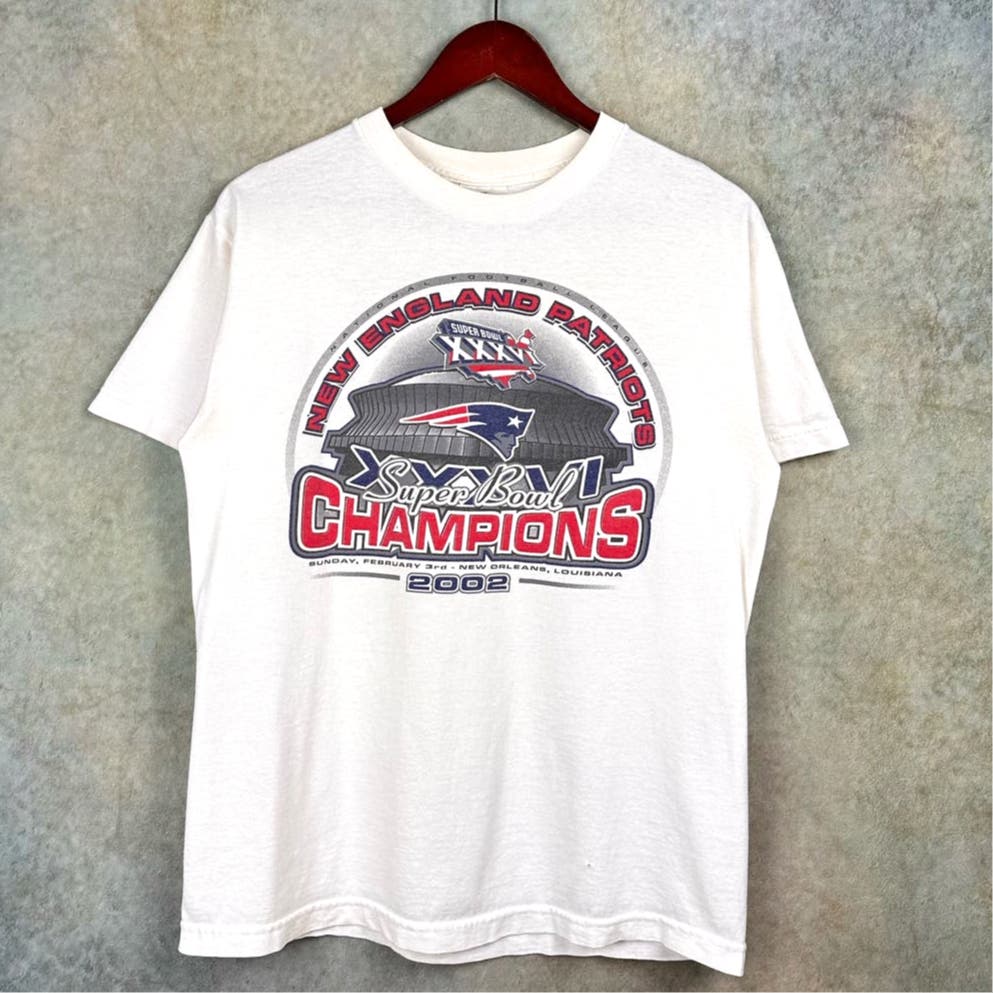 - White 2002 NFL NE Patriots SB XXXVI Champs double sided graphic tee
