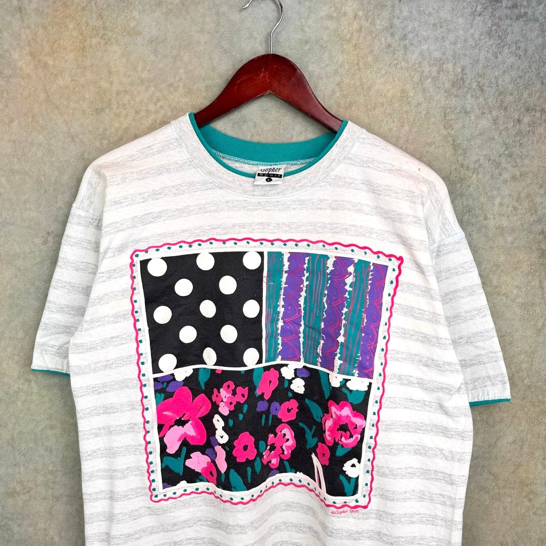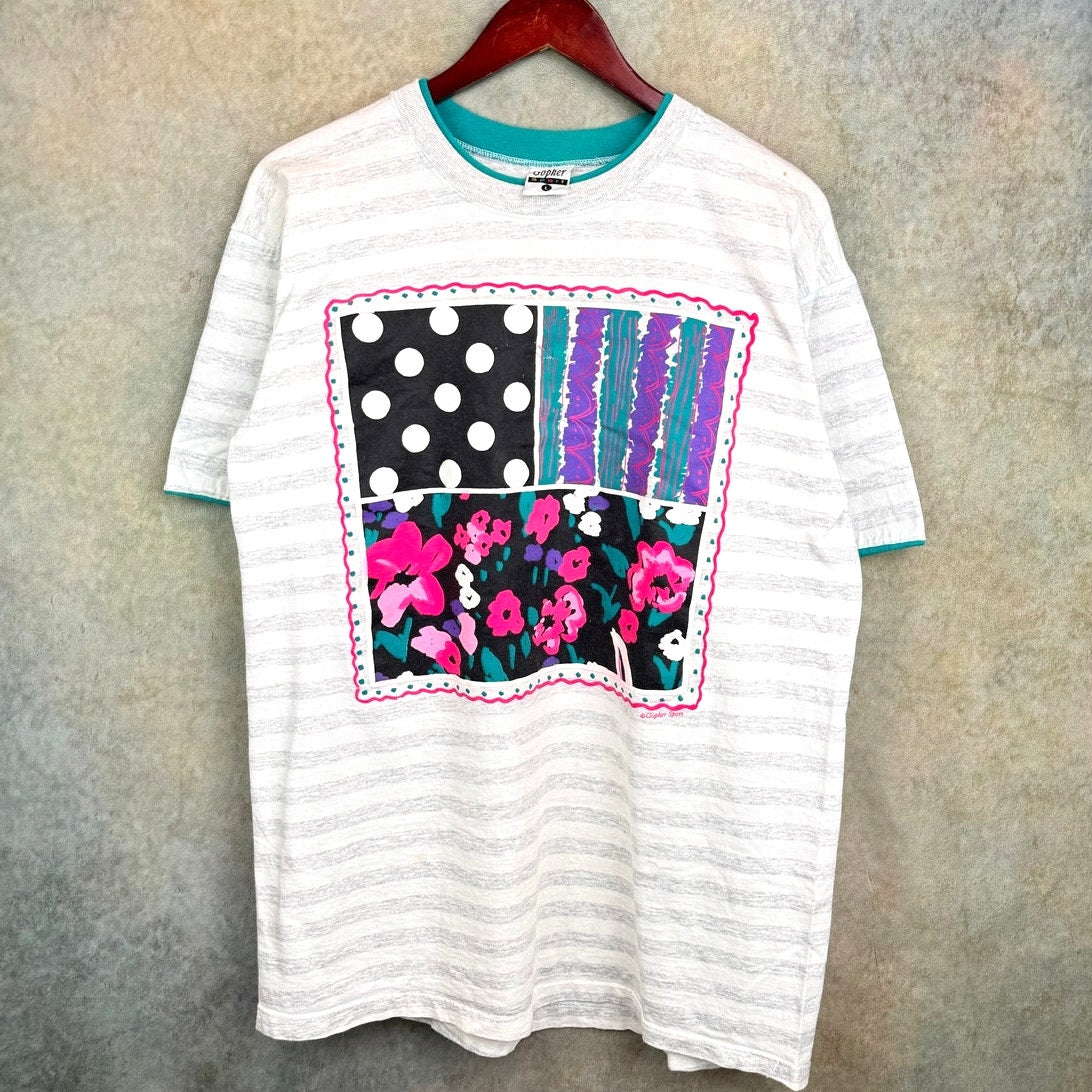 VTG 90s Flower Striped Graphic T Shirt L