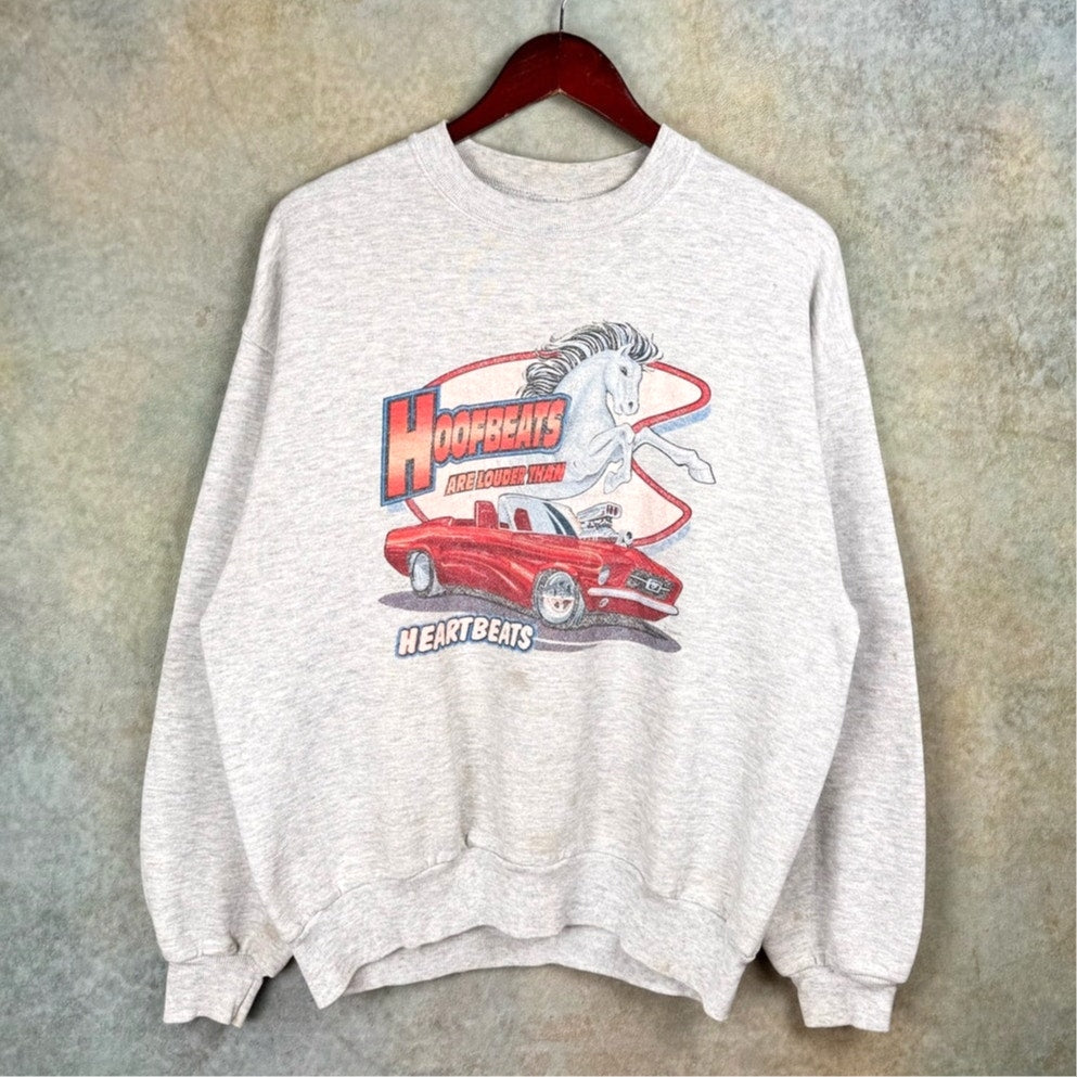 90s Gray Ford Mustang Graphic Pullover Sweatshirt "Hoofbeats are louder than heartbeats"
