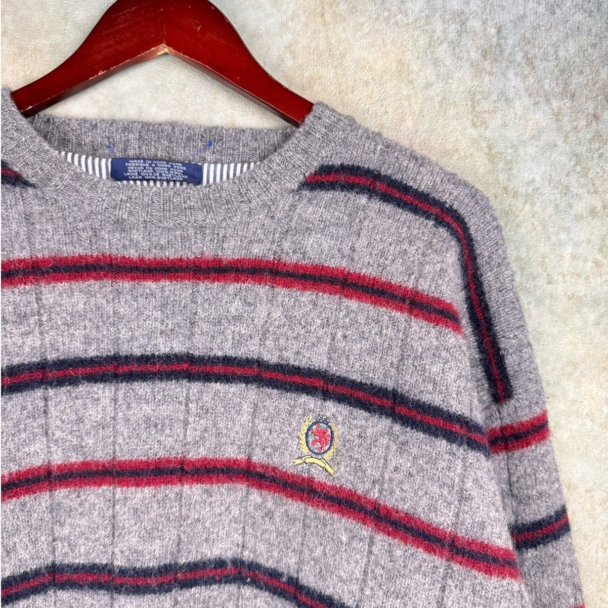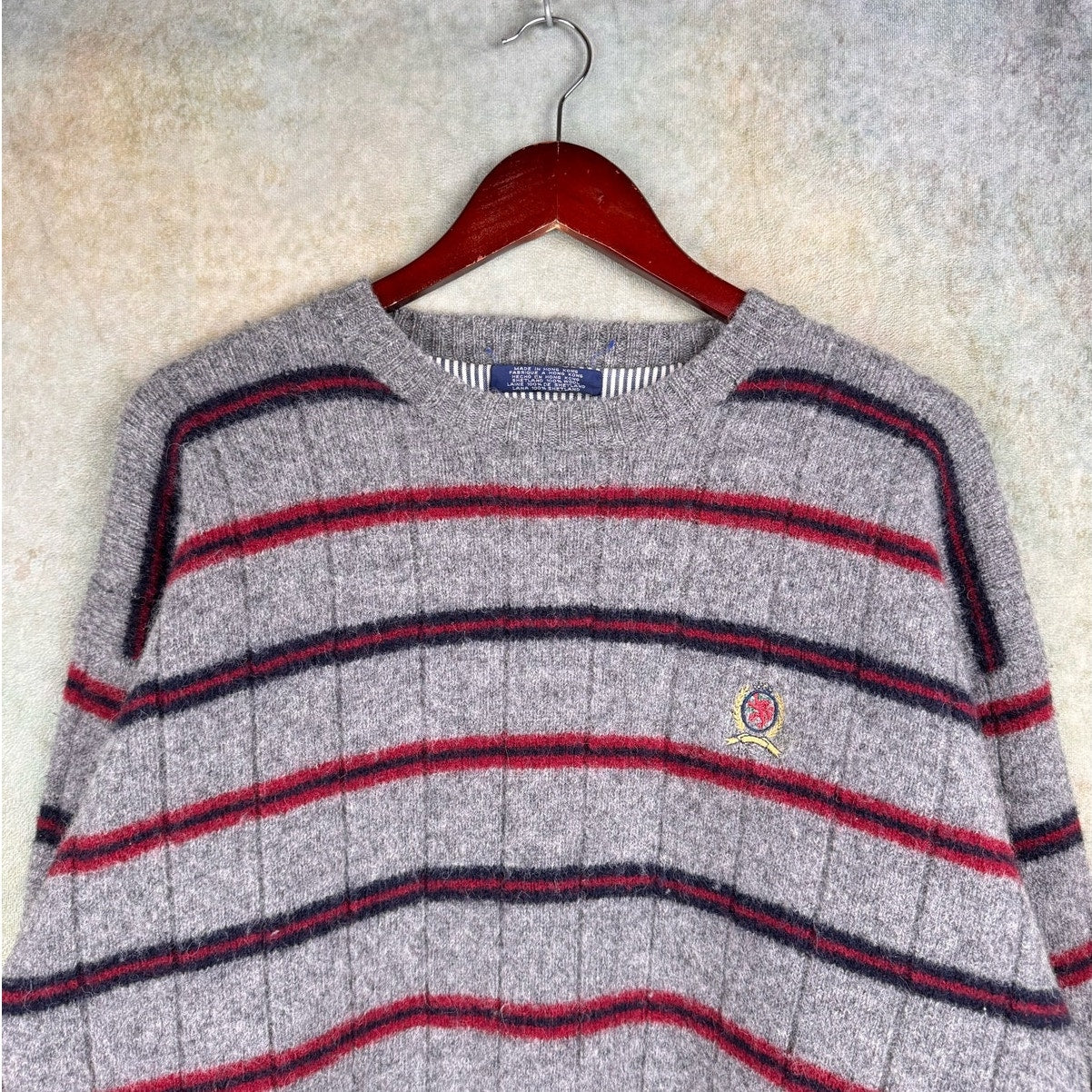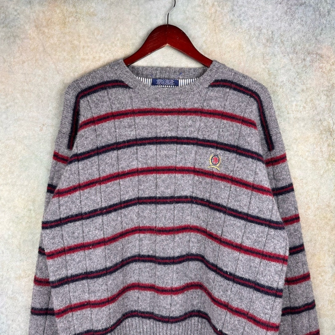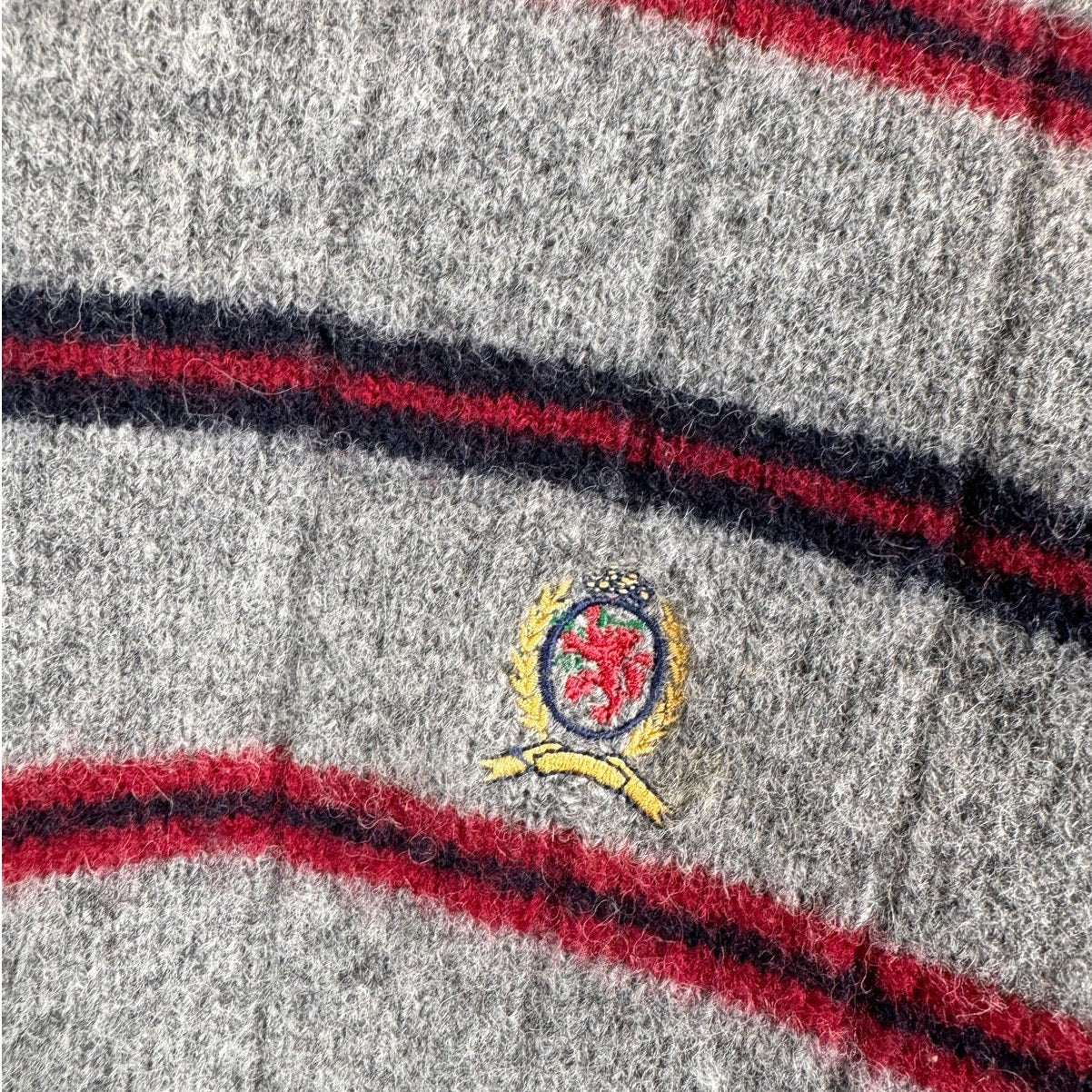 90s 100% Wool Tommy Hilfiger Crest Logo Striped Sweater in Gray Navy & Red