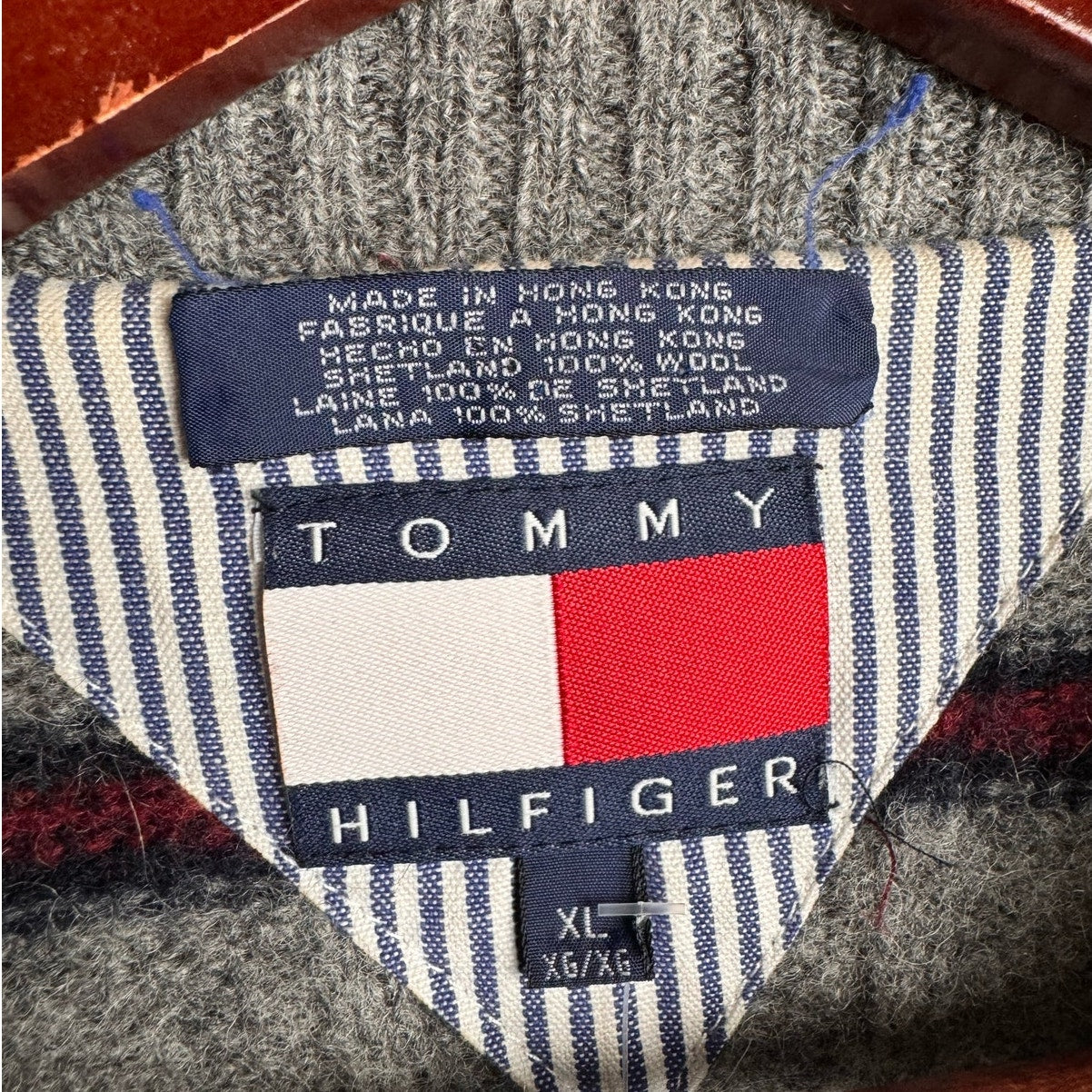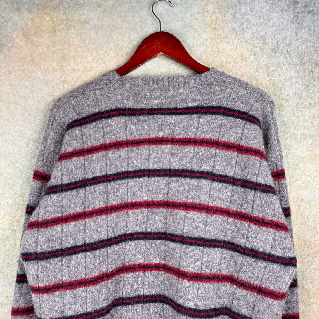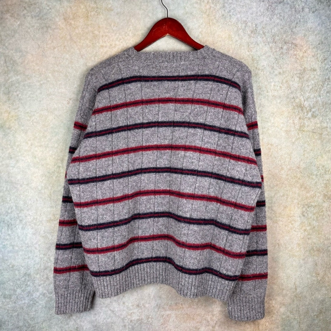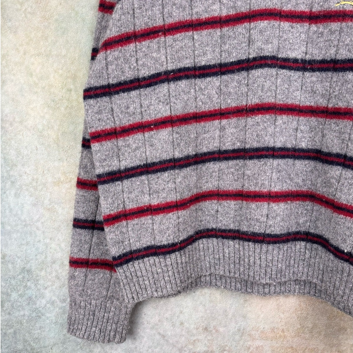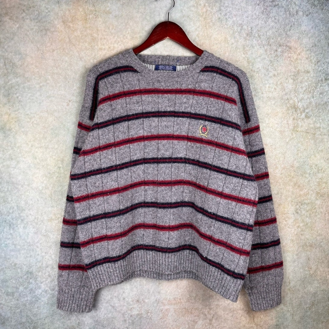 90s 100% Wool Tommy Hilfiger Crest Logo Striped Sweater in Gray Navy & Red