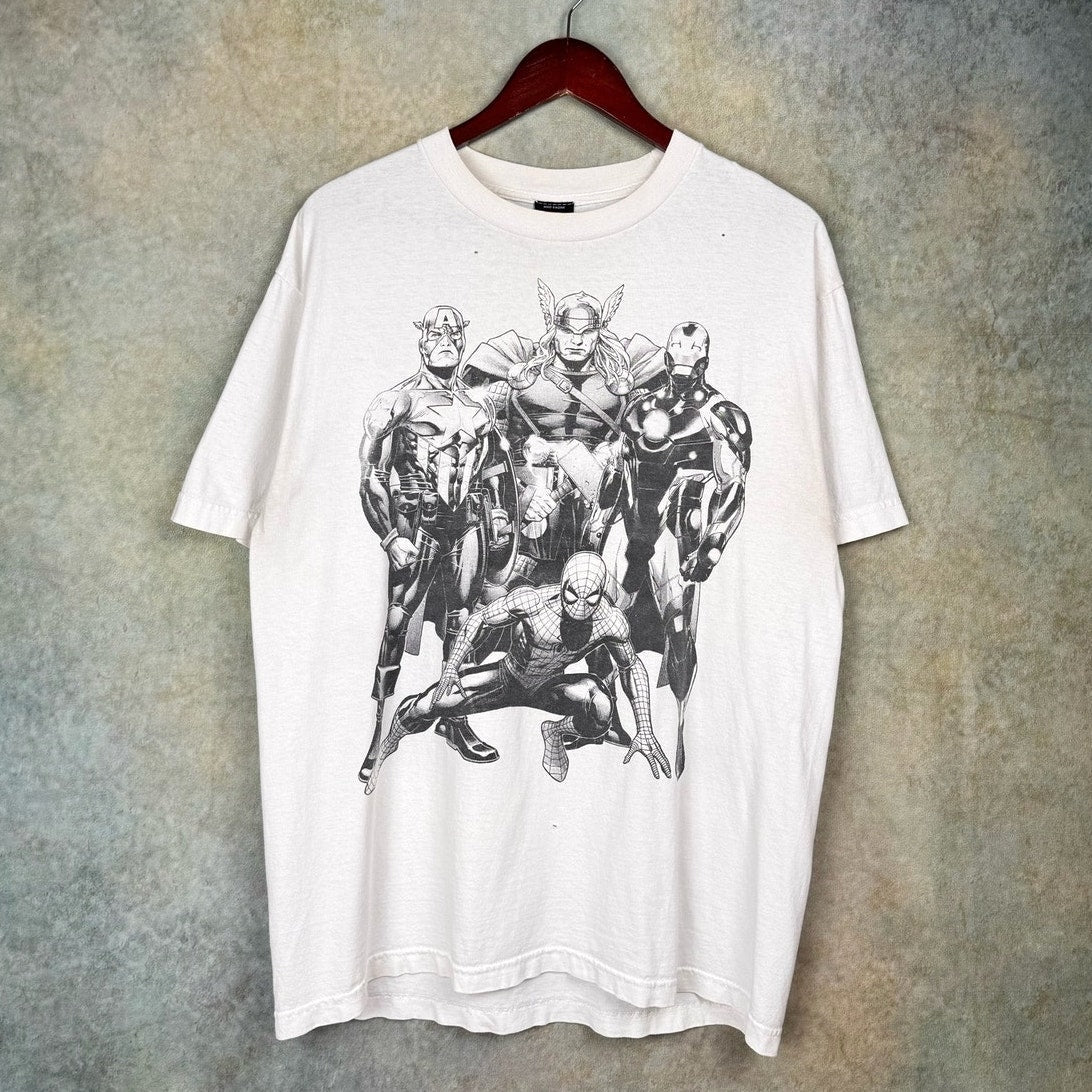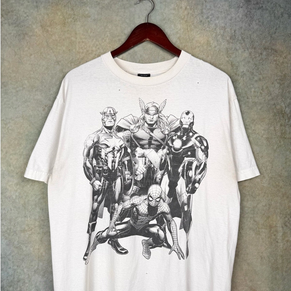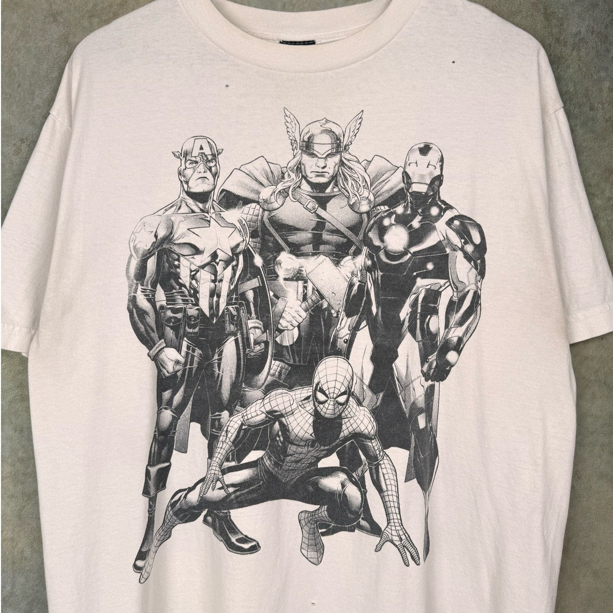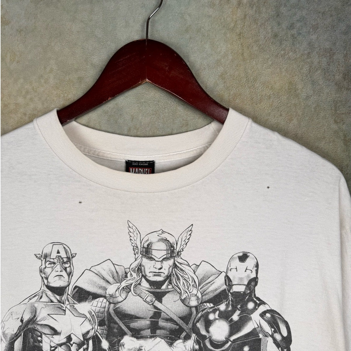 Black & White mad engine tee feat thor, spiderman, ironman, captain america